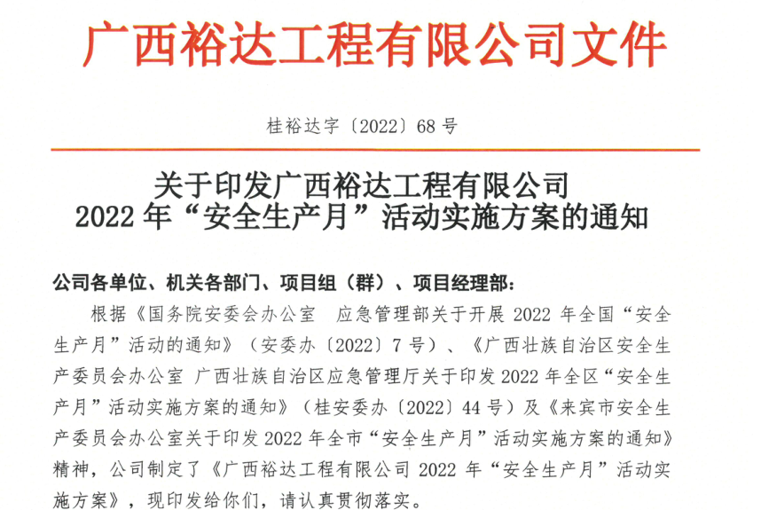 收到通知后公司积极响应贯彻落实并发布了《关于印发乐鱼网页版2022年“安全生产月”活动实施方案的通知》要求公司全体人员认真深入学习贯彻习近平总书记关于安全生产重要论述,加强活动组织部署。宣传贯彻安全生产法,强化主体责任落实。开展全员安全培训,分类强化警示教育。广泛开展宣传,营造良好安全生产氛围,以优异成绩迎接党的二十大顺利召开。
