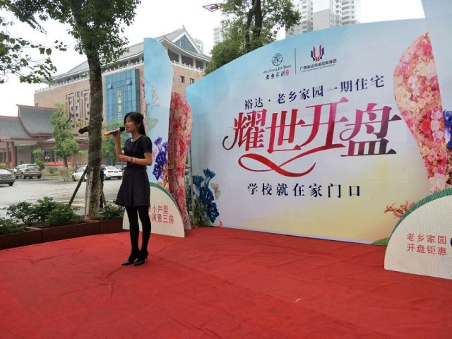 开盘当天,为感恩回馈客户,入场客户不仅赠送精美小礼品和糕点,舞台现场还准备了丰富的节目表演和幸运抽大奖活动。虽然天公不作美,下起了小雨,却丝毫不能阻挡客户们购房的热情!早上8点,已经开始有客户陆陆续续进场。上午9点半,开盘舞台活动正式开始。主持人宣讲项目信息后由集团总裁助理莫丽欢女士上台致辞,宣布活动正式开始。