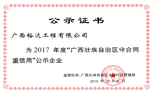2017年度广西“守合同重信用”企业,是自治区工商局对申报企业的品牌经营管理、合同信用管理、合同履行状况以及企业经营效益等方面内容,经过严格的评价后,对达到规定标准的企业向社会予以公示和表彰的一种荣誉。