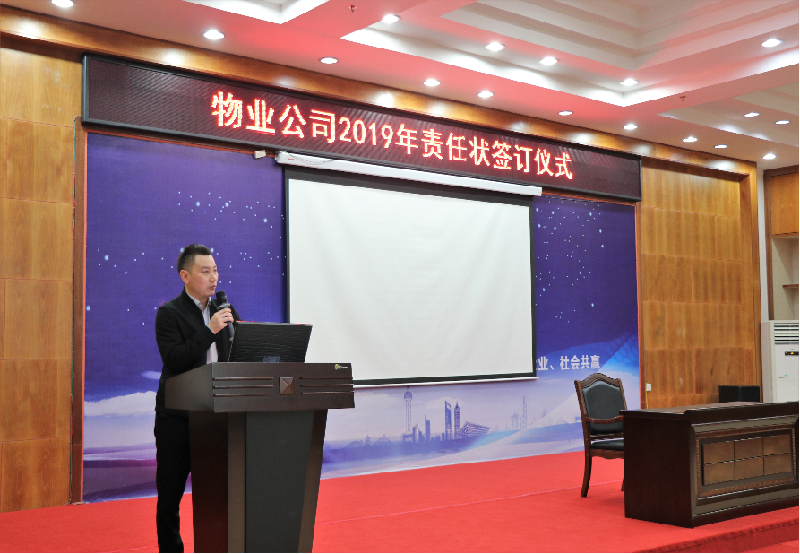 仪式签订后,物业公司总经理张林就2019年目标责任状签订仪式做了总结性讲话。张总表示,2019年责任状的签订为公司年度目标任务的达成起到了积极的作用,同时也给在场的各个责任人明确了目标。2019年的责任状与往年相比,考核指标更加细致,更有依据和说服力。同时强调,此次目标责任状的签订仪式,公司将严格各项目标责任的考核,坚决不走形式。最后,勉励大家稳抓稳打,同时要求,在场的所有管理层,在2019年主动谋划,主动有为,克服一切困难,完成公司的经营管理目标。