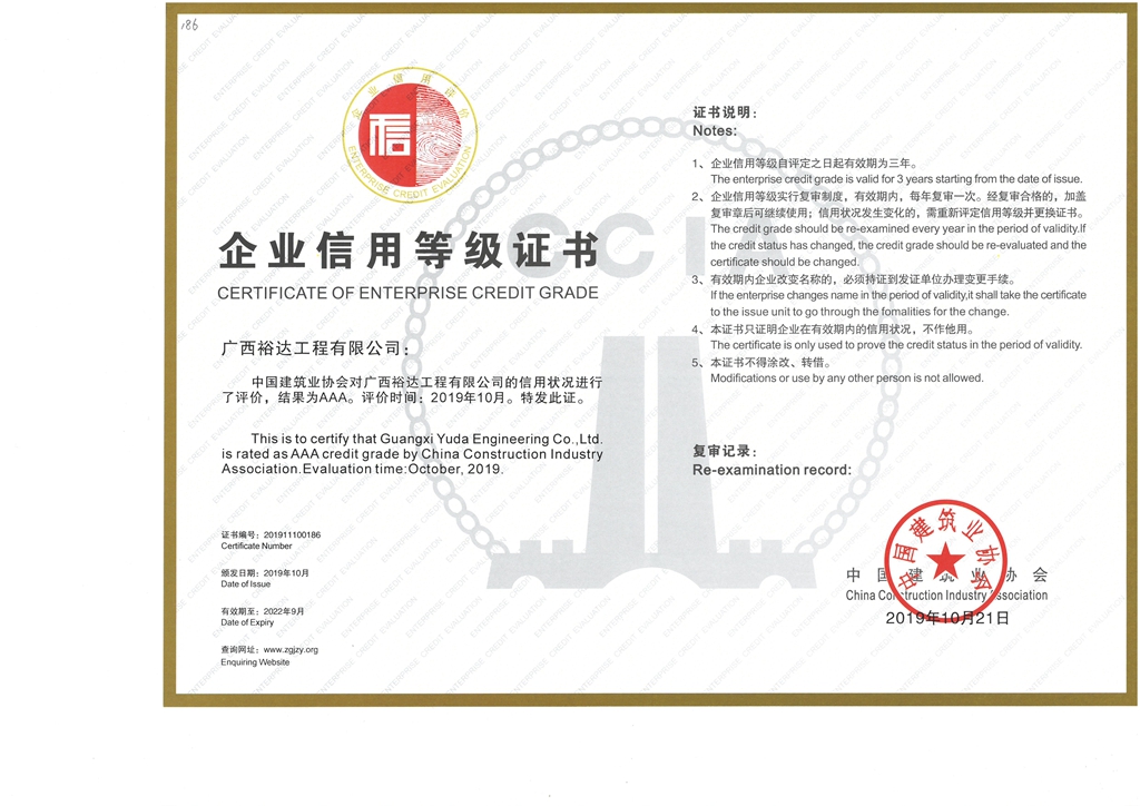 10月31日,中国建筑业协会在合肥召开2019年度全国建筑业AAA级信用企业发布会,广西裕达工程有限公司喜获“AAA级信用企业”荣誉称号,这是公司首次荣获该殊荣。