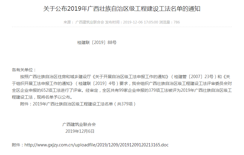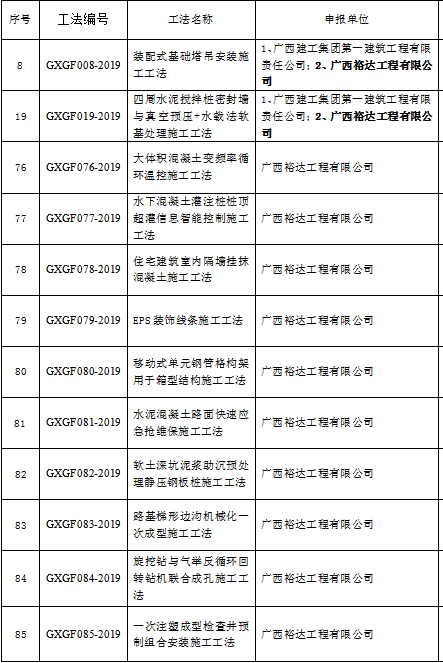 近日,从广西建筑业联合会发布的关于公布2019年广西壮族自治区级工程建设工法名单的通知》获悉,工程公司申报的“大体积混凝土变频率循环温控施工工法”等10项自主研发工法以及“装配式基础塔吊安装施工工法”等4项合作研发工法,被评为2019年广西壮族自治区级工程建设工法。获评数量超过历年最高纪录3倍,也使工程公司本年度的工法业绩在原有基础上获得重大突破。