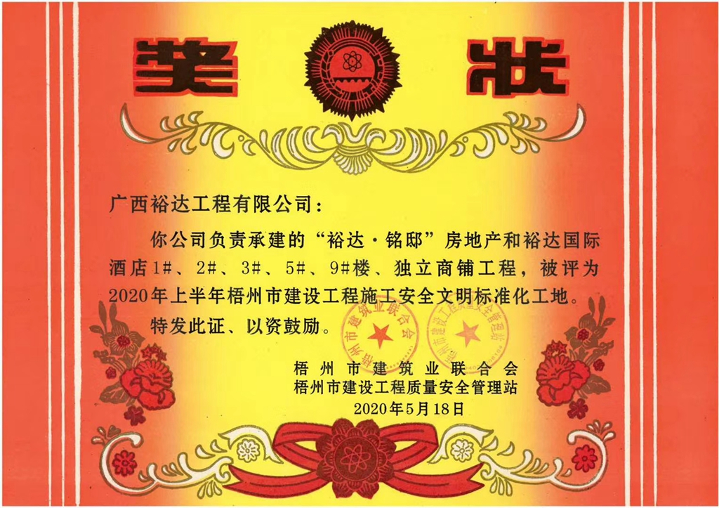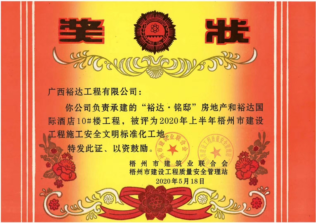 2020年5月18日,藤县裕达·铭邸和裕达国际酒店10#楼工程、1#、2#、3#、5#、9#、独立商铺工程喜获由梧州市建筑业联合会和梧州市建设工程质量安全管理站组织评选的2020年上半年梧州市建设工程施工安全文明标准化工地。