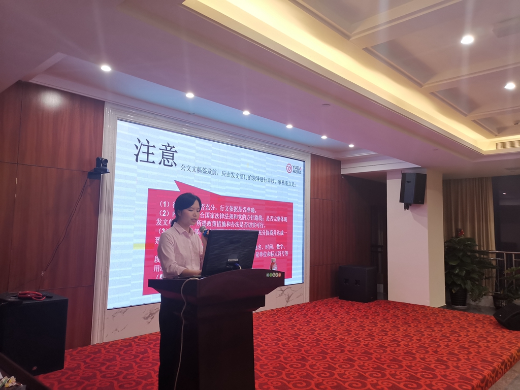 培训课上,林悦副主任讲述了公文写作的行政人员的基本技能、文件排版的基本要求,结合目前公司公文模板案例,分析、讲解了公文处理的技巧和实际常用问题,并安排了现场练习与大家互动。