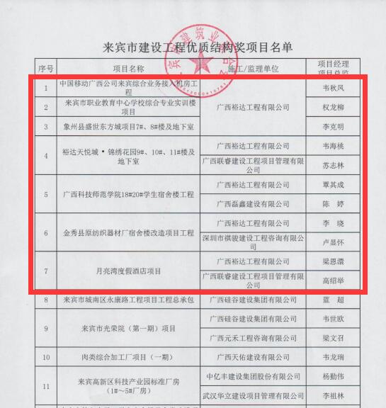 2020年下半年,共有19个项目被评为来宾市2020年下半年来宾市安全文明标准化工地,其中,裕达工程获评6项,分别为:来宾职业教育中心学校综合专业实训楼项目、象州县华锦公馆、广西科技师范学院18#20#学生宿舍楼工程、裕达天悦城·明珠花园25#、26#楼、裕达天悦城·锦绣花园10#、11#楼和金秀县原纺织器材厂宿舍楼改造项目工程。今年,是来宾首届评比建设工程优质结构奖,全市共有26个项目申请参评,最后有20个项目获评,其中,裕达工程喜获7个项目,分别为:中国移动广西公司来宾综合业务接入机房工程、来宾职业教育中心学校综合专业实训楼项目、象州县盛世东方城项目7#8#楼及地下室、裕达天悦城·锦绣花园9#、10#、11#楼及地下室、广西科技师范学院18#20#学生宿舍楼工程、金秀县原纺织器材厂宿舍楼改造项目工程和月亮弯度假酒店项目。