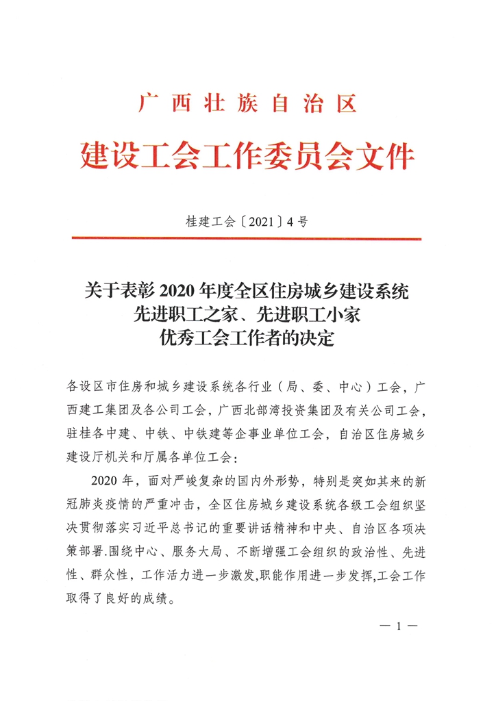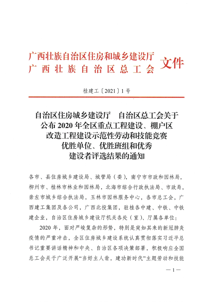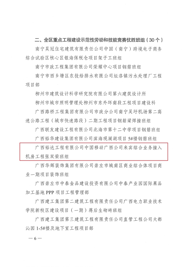 近日,从自治区住建厅及自治区总工会获悉,工程公司自营项目中国移动广西来宾综合业务接入机房工程(简称“移动项目”)再获表彰,荣获“2020年度全区重点工程建设示范性劳动和技能竞赛优胜班组”和“2020年度全区住房城乡建设系统先进职工小家”荣誉称号。