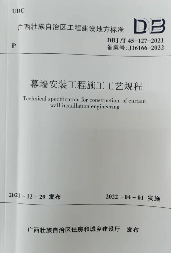 近日,由公司参编的《幕墙安装工程施工工艺规程》的广西工程建设地方标准,经广西住房和城乡建设厅批准发布,于4月1日起正式实施。