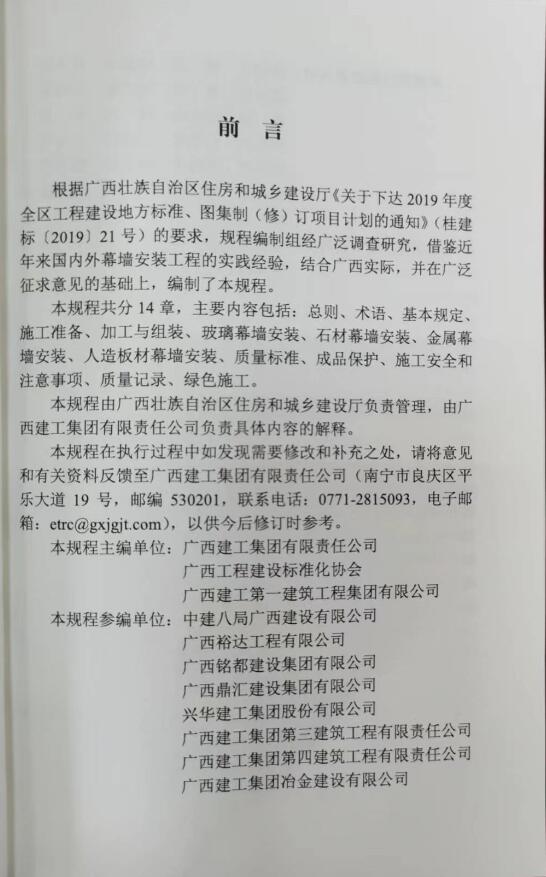 据悉,《幕墙安装工程施工工艺规程》由广西建工集团有限责任公司、广西工程建设标准化协会、广西建工第一建筑工程集团有限公司主编,中建八局广西建设有限公司、乐鱼网页版等共8家公司参编,共分为14个章节,内容包括总则、术语、基本规定、施工准备、加工与组装、玻璃幕墙安装、石材幕墙安装、质量标准、施工安全和注意事项、绿色施工等。该标准规范和指导了幕墙安装、屋面工程的施工工艺,推动了幕墙安装、屋面工程的标准化与规范化的进一步发展,填补了广西幕墙安装工程施工工艺规程的空白,对广西幕墙安装工程施工工艺规范的高质量发展有重要指导意义。