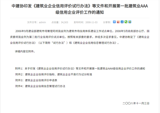 建筑企业信用等级证书,由中国建筑业协会通过各项指标对企业进行综合评估出示的信用等级报告,企业信用等级分为AAA(信用很好)、AA、A、B、C三等五级,实行动态管理,获证后前2年每年进行复审,每3年进行一次复评。既是企业的一种荣誉,也在许多商业活动中能够广泛应用。