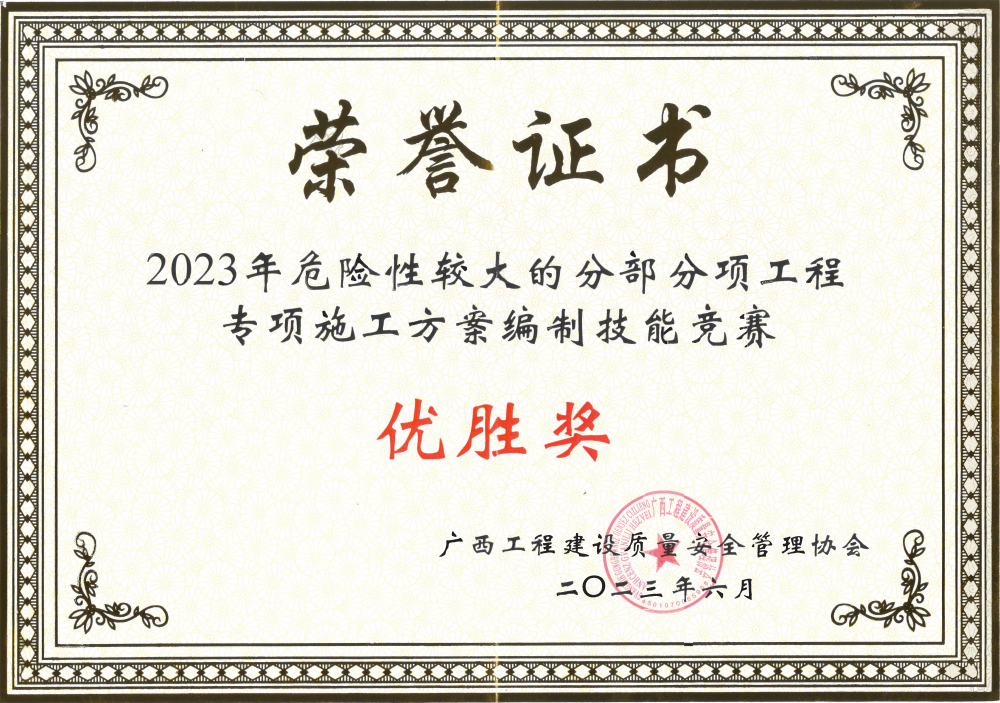 6月29日,工程公司在南宁参加由广西工程建设质量安全管理协会主办2023年全区建设工程危大工程专项施工方案编制技能晋级决赛,喜获优胜奖。