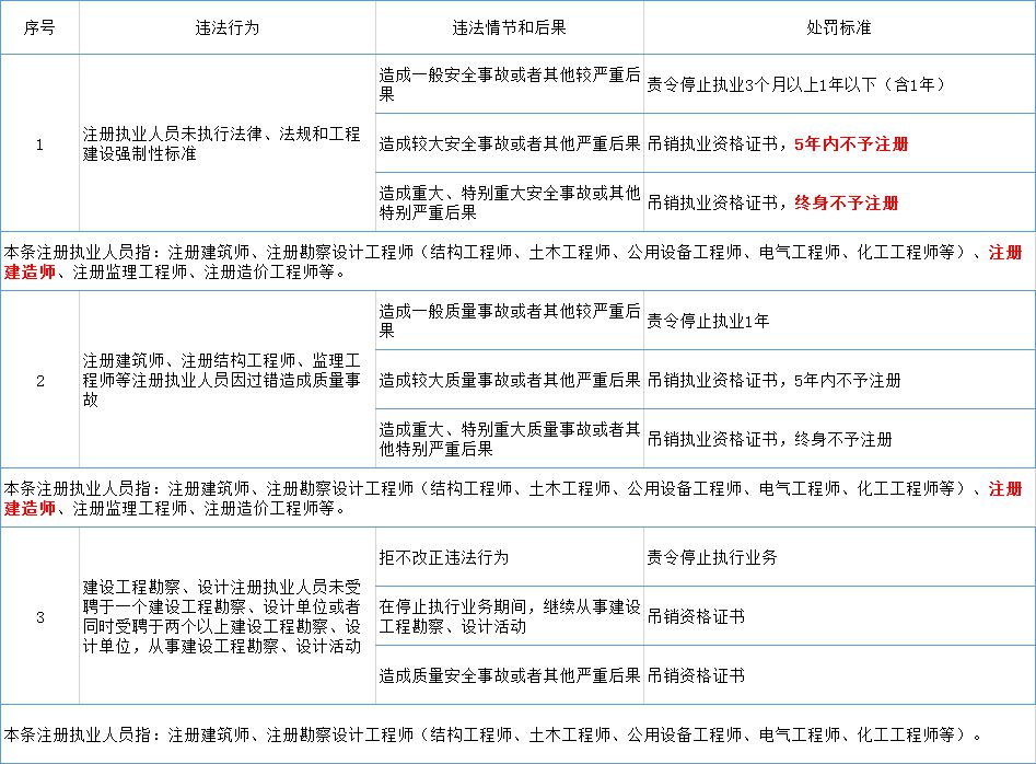 今年9月,住建部发布《住房和城乡建设部工程建设行政处罚裁量基准》,对注册执业人员违法违规造成事故的,根据情节及后果予以处罚,最严重的将吊销证书,终身不予注册!具体如下: