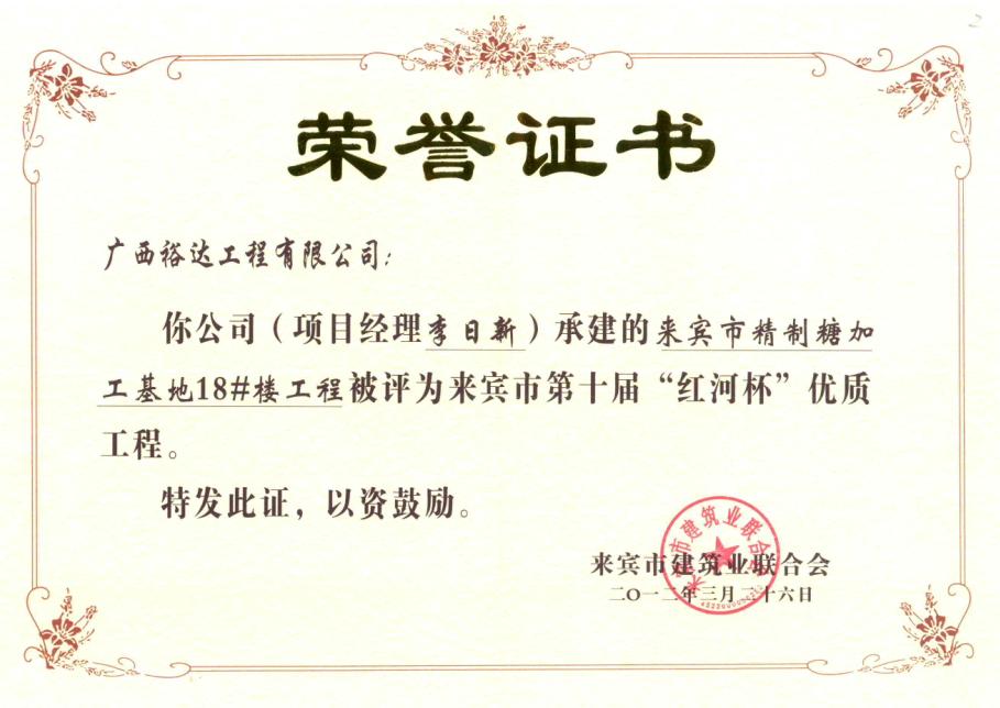 2012年来宾市第十届“红河杯”优质工程