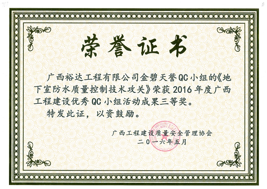 2016年度广西工程建设优秀QC小组活动成果三等奖《地下室防水质量控制技术攻关》-金碧天誉QC小组
