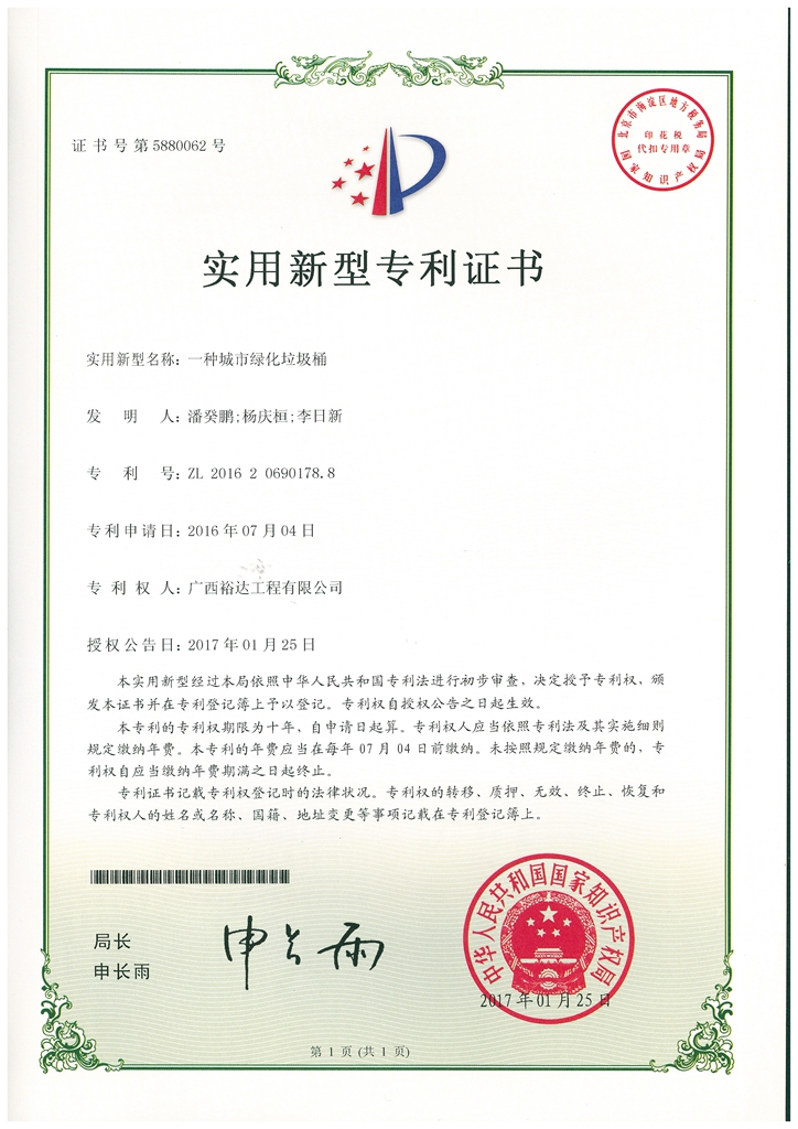 2017年实用新型专利证书(一种城市绿化垃圾桶)