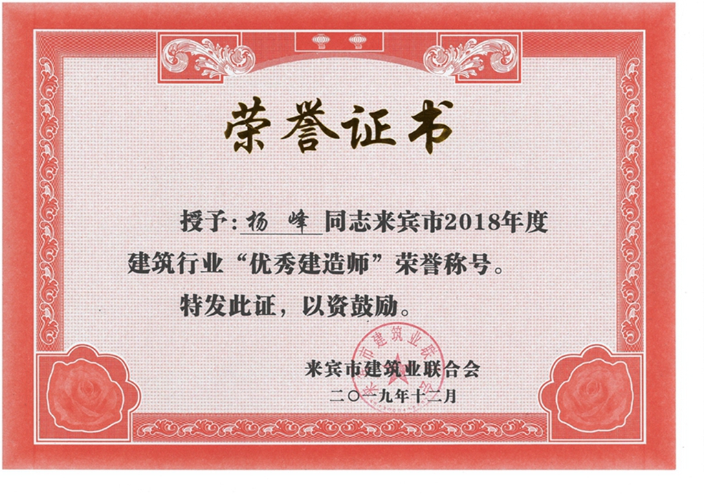 杨峰来宾市2018年度建筑行业“优秀建造师”荣誉称号