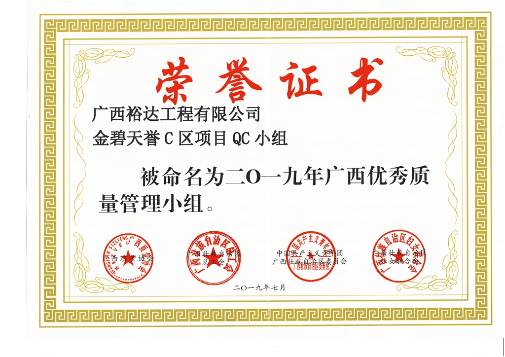 乐鱼网页版金碧天誉C区项目QC小组被命为2019年广西优秀质量管理小组